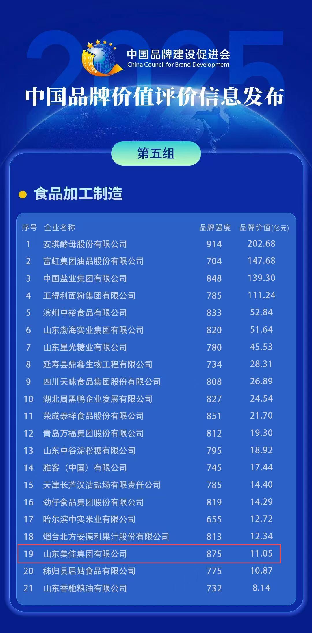 近日,由中國品牌建設(shè)促進會主辦的“2025中國品牌價值評價信息發(fā)布暨論壇”在浙江德清舉行,會上公布了最新中國品牌價值榜單。此次榜單中,美佳集團的品牌強度達875,品牌評價價值達11.05億元,品牌影響力和行業(yè)地位再上新臺階!